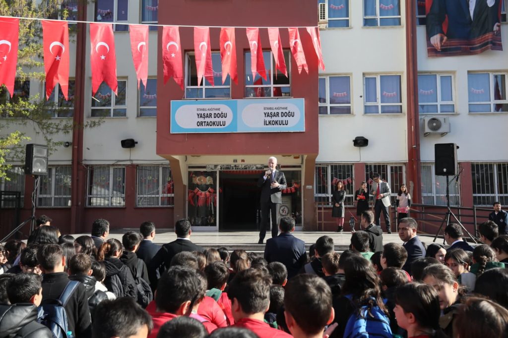 “Sosyal, sportif ve kültürel faaliyetler anlamında sizleri hayata hazırlamak istiyoruz. Bununla ilgili dört önemli projemiz var. Birincisi, her birinizin spor yapmasını istiyoruz, lisans çıkarmanızı istiyoruz. Sporla birlikte hem bedenen hem de ruhen gelişmenizi hedefliyoruz. İstanbul’da 1 milyon lisanslı sporcu hedefimiz var, şu anda 840 bin lisanslı sporcumuz bulunuyor. İnşallah yılsonuna kadar hedefimizi tamamlamış olacağız. İkincisi, sizlerin kitap okumasını istiyoruz. Okullarımızdaki kitap sayısını 6 buçuk milyondan 13 milyona çıkardık. Sizlerin kitap okumasını destekliyoruz. Her akşam saat 21.00’de teknolojik aletleri kapatarak ailenizle birlikte kitap okumanızı istiyoruz. Üçüncüsü, yeteneklerinize göre bir enstrüman çalmanızı istiyoruz. ‘Enstrümansız okul kalmasın’ projesiyle tüm okullarımızda müzik atölyeleri oluşturacağız. Dördüncüsü ise öğrenci meclislerimizdir. Okul, ilçe ve il öğrenci meclisleri aracılığıyla karar süreçlerine katılmanızı, istemediğiniz konularda hayır diyebilmenizi, merhametli ve vicdanlı bireyler olarak yetişmenizi istiyoruz. Polisiye tedbirleri geçmişte aldık, bundan sonra daha da artıracağız. Ancak bu saydığım dört proje aslında bizleri kötülüklerden koruyan ve hayata hazırlayan en önemli unsurlardır.”