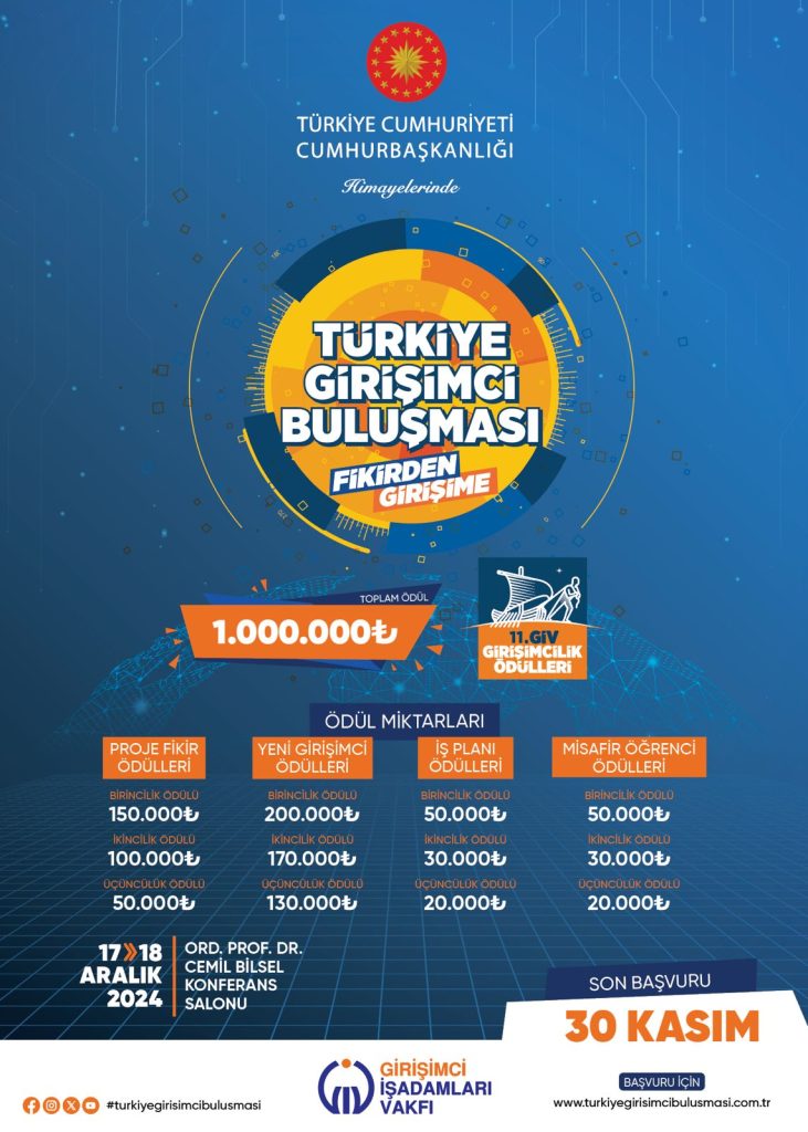 Türkiye Girişimci Buluşması ve 11. GİV Girişimcilik Ödülleri; Girişimci İşadamları Vakfı (GİV) tarafından, Cumhurbaşkanlığı himayelerinde, İstanbul Üniversitesi, Türkiye Gençlik Vakfı (TÜGVA) ve Türkiye Gençlik STK’ları Platformu (TGSP) iş birliğiyle 17-18 Aralık 2024 tarihlerinde İstanbul Üniversitesi Ord. Prof. Dr. Cemil Bilsel Konferans Salonu’nda (İstanbul) gerçekleştirilecek.